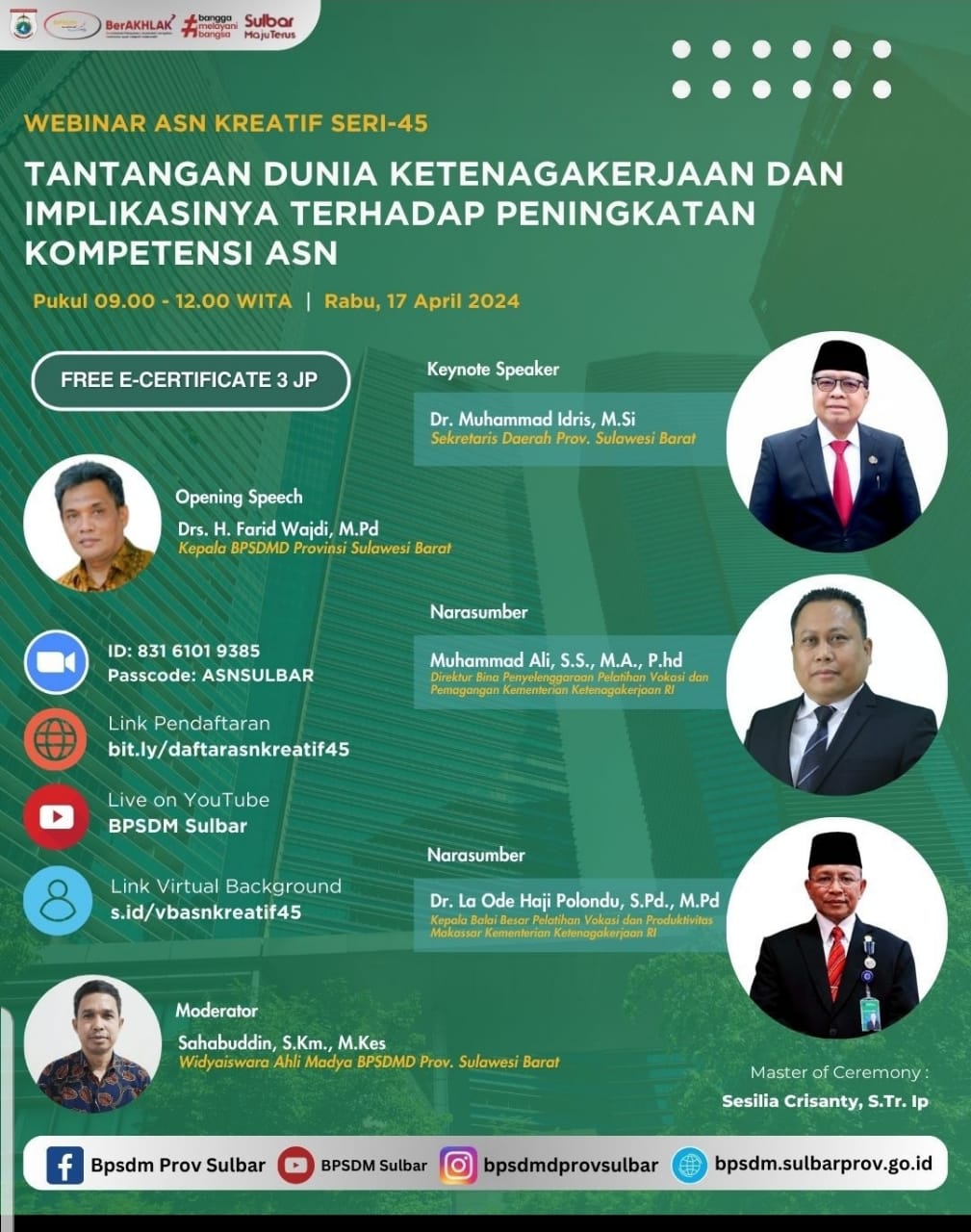 Mamuju – BPSDMD Provinsi Sulawesi Barat kembali menunjukkan komitmennya dalam meningkatkan kompetensi Aparatur Sipil Negara (ASN) dengan menggelar Webinar ASN Kreatif Seri-45.