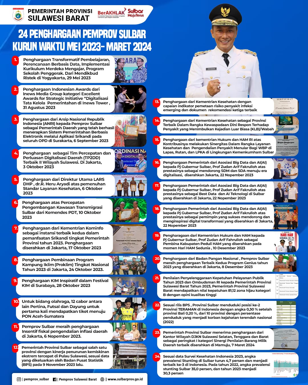Tercatat 24 penghargaan yang didapatkan pemprov Sulbar sejak kepemimpinan Prof. Zudan, diantaranya :