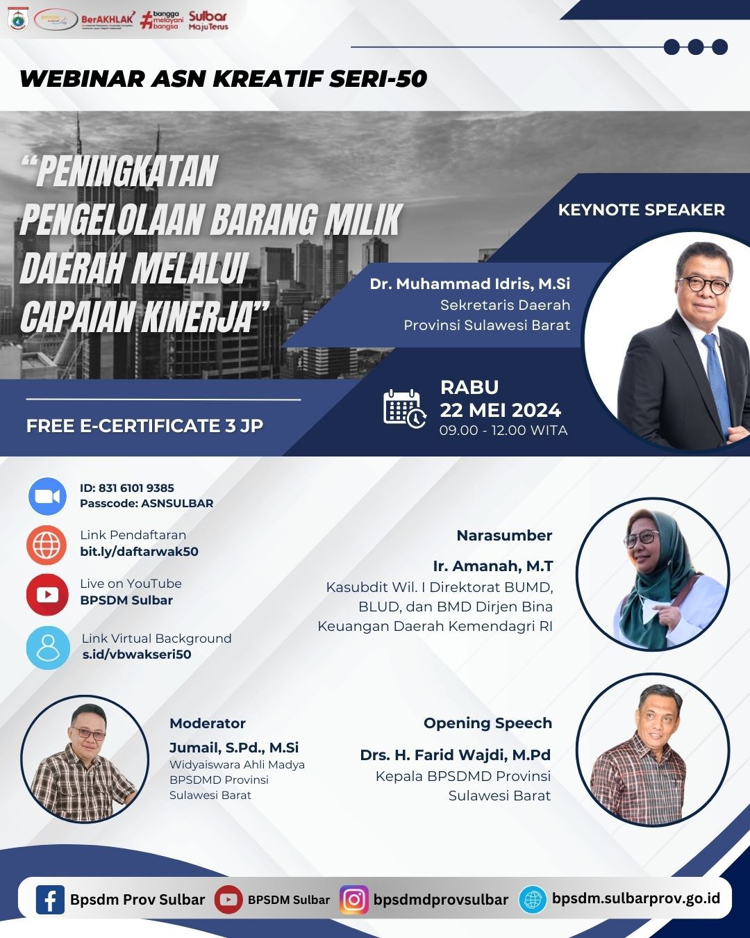 Mamuju-BPSDMD Provinsi Sulawesi Barat dijadwalkan akan kembali menggelar webinar ASN Kreatif Seri ke-50 dengan tema “Peningkatan Pengelolaan Barang Milik Daerah Melalui Capaian Kinerja” pada Rabu, 22 Mei 2024.