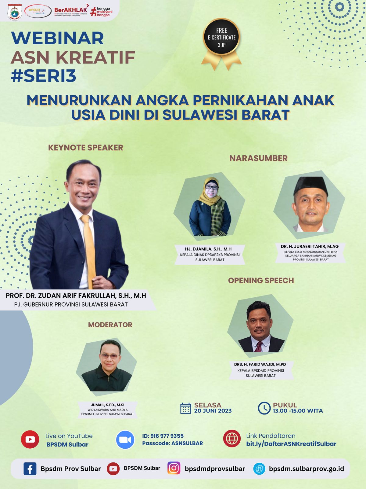 Webinar kali ini mengusung tema “Menurunkan angka pernikahan anak di Sulawesi Barat”. Jumlah peserta yang mengikuti sebanyak 778 orang melalui zoom dan live Chanel Youtube BPSDM Sulbar. Menurut Keterangan Kepala BPSDMD Provinsi Sulawesi Barat Drs. H. Farid Wajdi, M.Pd. Program ini bernama ASN KREATIF yang dilaksanakan dalam bentuk Webinar berseri. Selain pelaksanaan pelatihan formal lainnya yang telah diselenggarakan oleh BPSDMD Provinsi Sulawesi Barat kami juga melaksanakan Webinar sekali dalam seminggu sebagai wujud tanggung jawab untuk memenuhi hak pengembangan kompetensi 20 jam pelajaran bagi ASN”.